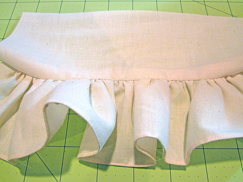 NOTE: You can also cut your strip to be gathered at double the width and fold it in half, creating a folded finished edge. In this case you would then be gathering two layers rather than one. This is often used for the ruffled edge of a blanket.