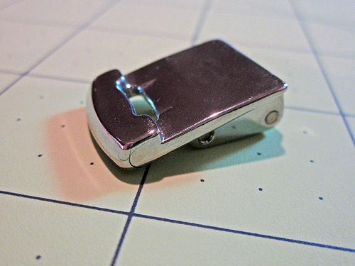 Specific instructions come with this foot. In order to sew successfully, you have to lengthen the stitch to 3.0 mm or longer, and tighten the tension slightly. In combination with these stitch adjustments, what really makes this foot work so well is how it’s designed underneath. A “bump” on the bottom of the foot causes the fabric to feed slowly against the feed dogs of the machine.
