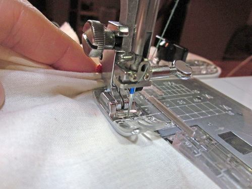 - Sew slowly and stop periodically (with the needle down) to check the positioning. The gathered edge creates an uneven surface that can become bunched up or slip out from under the foot. You can use a pin or stiletto as you sew to keep the gathers from becoming unruly.