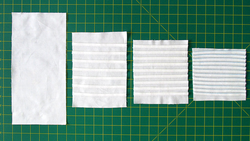 In the photo below, the starting panel at the left is 12” wide. When the guidelines were spaced at 1½”, seven tucks were generated and the panel reduced to 8”. At 1¼” spacing, nine tucks could be made, but the finished panel is now reduced to 6¾”. At the far right, the spacing guidelines were drawn 1” apart, which yielded a dozen tucks and a panel that is now just 5½”.