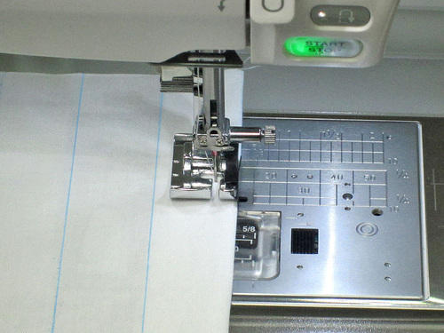 - Place the folded fabric under the Quarter Inch Seam foot, aligning the fold with the foot’s flange.