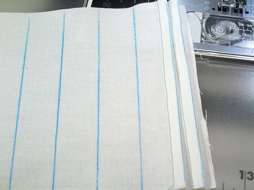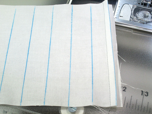 - Once your spacing has been determined, draw in parallel guidelines at this distance across your fabric panel. You are working on the right side of the fabric, so make sure your marking tool is one that can be easily wiped away or will vanish with exposure to the air or the heat of an iron. We drew fairly heavy lines in order to allow them to show up in the photos, but of course, yours can be much lighter.