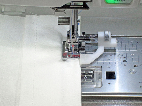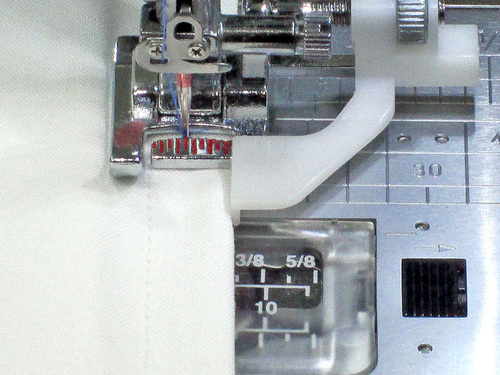 - Slide the fabric under the foot so you are working on this single tuck. The inside edge of the Edge Guide’s measurement “toe” is aligned with the tuck’s original seam line and the white plastic guide is open all the way to the right against the fold of the tuck.