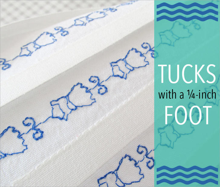 Narrow tucks, called pintucks when they are super-duper narrow, are most often used in the world of heirloom sewing, but they can add a lovely bit of detail to many other types of projects. You can create this look quickly and easily with your Quarter Inch Seam foot. Tucks can be sewn in thread to match the fabric for a classic tone-on-tone look. Or, switch to a contrasting thread for extra detail along the stitch line. For even more embellishment, amp up the accent with decorative stitching between tucks or directly on top of each tuck.