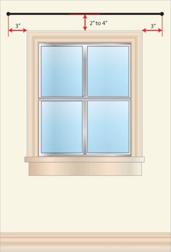 How far to either side of the window do you want your hanging rod to extend? This will be based on fabric weight as well as general look and feel; eg. how big you want the window to appear. Very heavy fabric can bow a long rod; either narrow your span or add a brace to the center of the rod. Mark each side of the window. Then write it on your piece of paper where you sketched out your plan. If you don’t have anything to follow, 3″ to either side of the trim is a common standard.