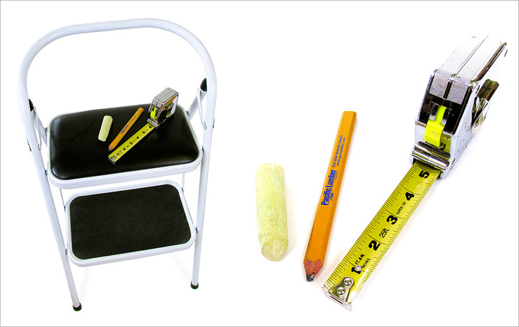 You definitely want to use a step ladder or a step-stool that’s tall enough to get you eye level with the top of the window. Reaching waaaaay up to mark is more difficult, and because of your angle of view, it can add inaccuracy to your markings.