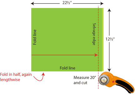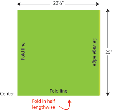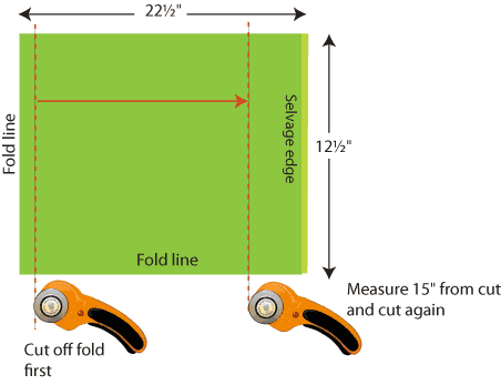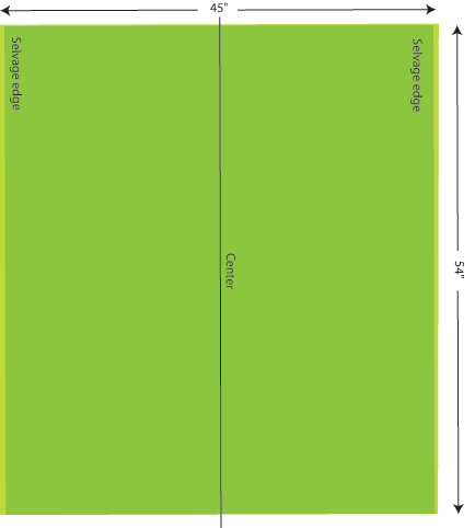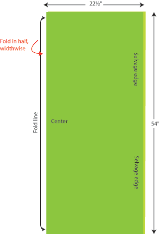 Fold the fabric in half widthwise, selvedges together. So the folded piece now measures 22½” x 54″.