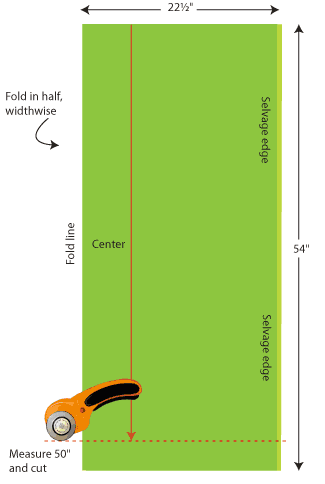 Measure and cut 50″ in length. You could either measure down 50″ from the top or up 4″ from the bottom. Place your ruler and cut through both layers with your rotary cutter.