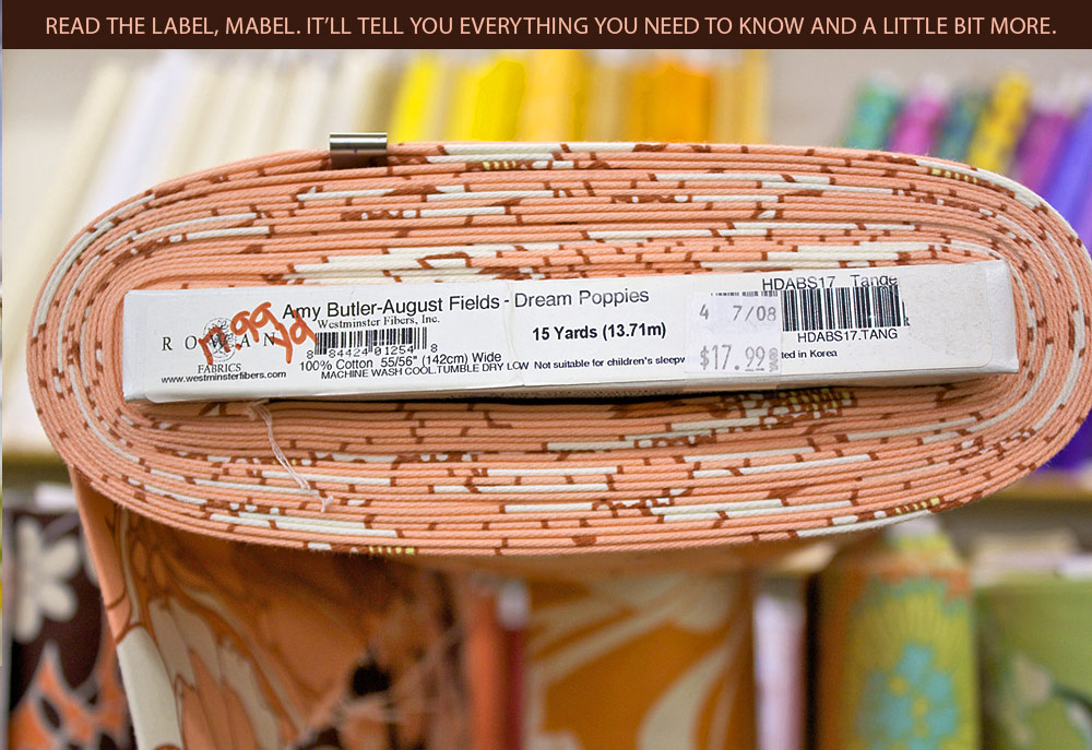 When you walk into a fabric store, you’ll notice most fabric is wrapped around cardboard bolts that stand upright on shelves or racks. What you may not notice is that at the end each bolt is a label that provides important information about the fabric. If you want 100% cotton, read the label so you don’t accidentally come home with a poly-cotton blend. But, there’s a lot more good information on that little label.