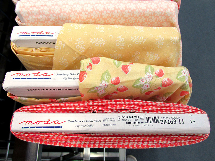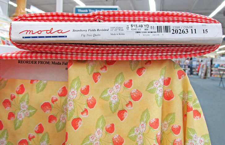 Taking all this information into account, I now know this particular fabric will work well for my project. And, from reading the label, I know the fabric I chose is part of the Strawberry Fields Revisited collection. If I decide to mix in some additional fabrics with my main gingham, I know the colors and patterns from this collection will go well together.
