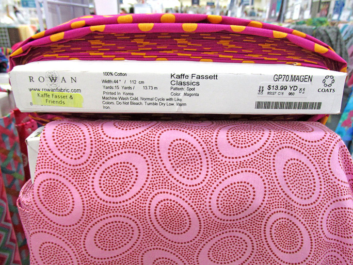 The look of bolt ends vary by manufacturer and some have less information than others. But the basics are always there: Width, Content, and Price. As shown above on the Rowan Fabrics bolt label, many manufacturers will also include basic fabric care facts, another handy bit of advice.