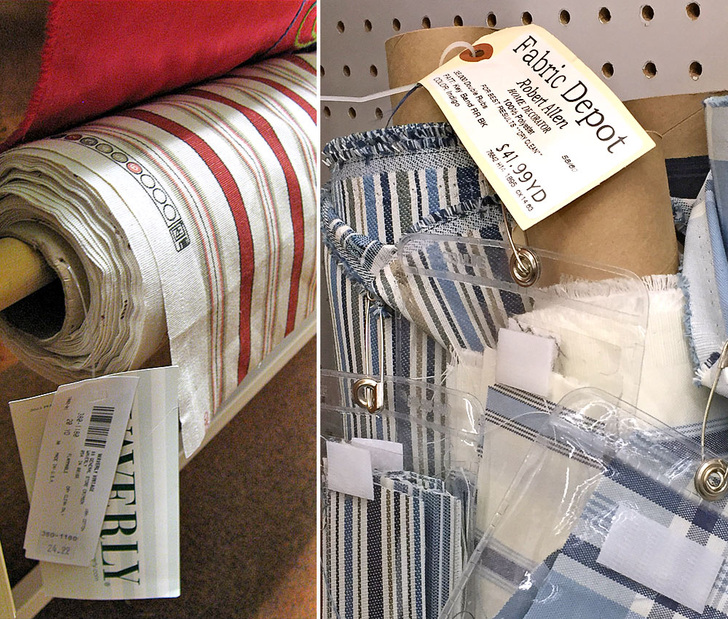 In some larger stores, you’re also likely to see fabric hanging horizontally from wooden dowels. These rolls are usually wider (54″+) home décor options, such as drapery and upholstery fabrics. In this case, look for a hang tag with the important fabric information.