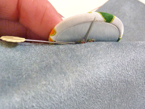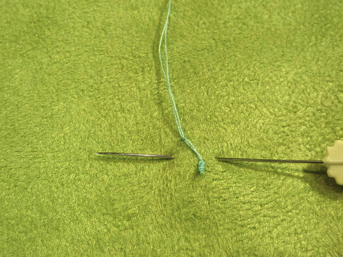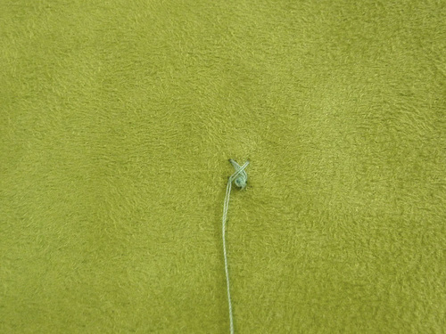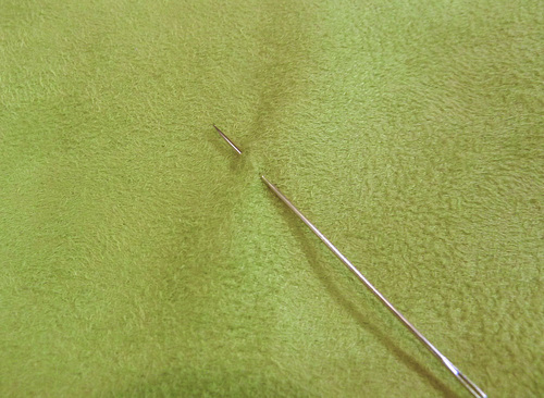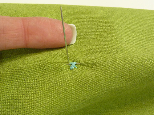2. As above, take a tiny stitch just through the top layer of the fabric at your marked point to secure your knot. Place a pin at the marked point.