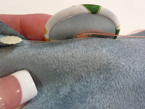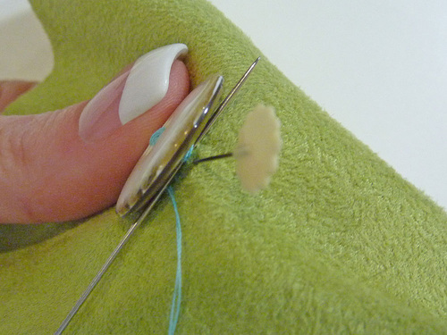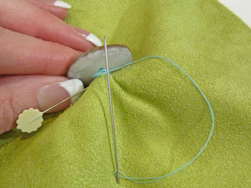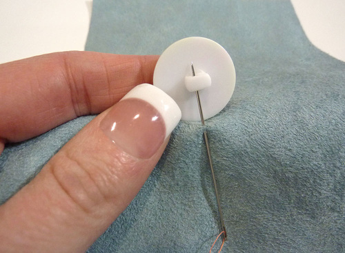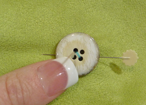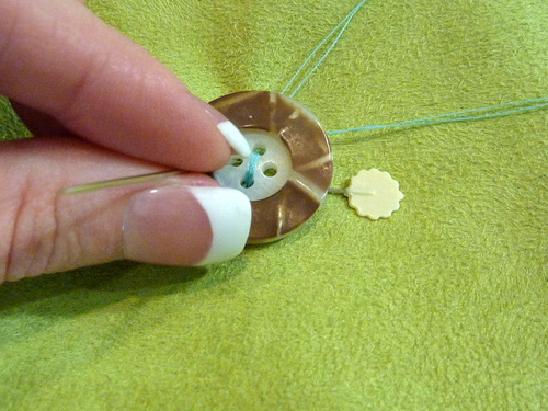 7. Bring the needle up through one hole of the button, then down through the hole across from it, passing the needle all the way through the fabric each time: front to back and then back to front.  Repeat this several times to insure your button is secure.