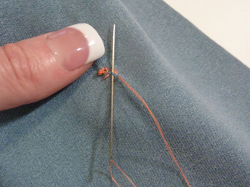 4. Pull the needle up through the fabric, from the back to the front, in the location where you would like to place your button. (Because, of course, you’ve already figured out and marked where you want your button to be … right?)