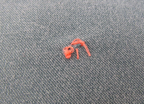 2. Thread a needle in the same manner, but instead of initially pulling the thread from the back to the front, take a tiny stitch just through the front of the fabric at your marked point to secure your knot.