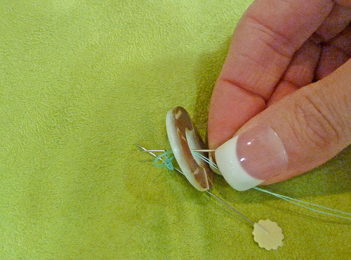 5. As above, once the button is secure, wrap the thread around and make your knot directly underneath the button. Gently pull the top layer away from the back to insure you don’t catch the back in your knot.