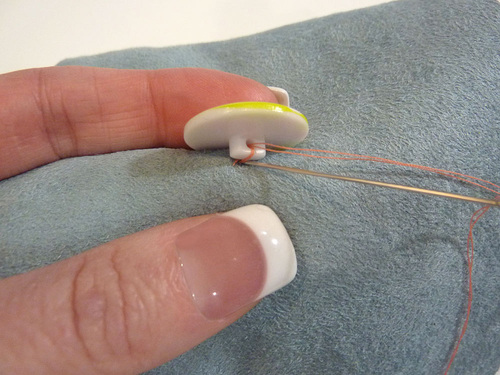 3. When stitching the button, just pull your thread through the single hole of the shank button four or five times. You can kind of tilt the button back and forth as you sew for better access.