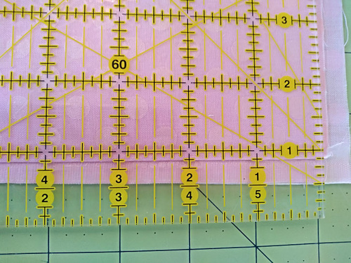 The ruler’s edge should be perfectly aligned with the vertical grid at the 12” measurement. Confirm this alignment both above and below the fabric. As in the steps above, the ruler’s vertical lines should be flush with the gridlines of the mat.
