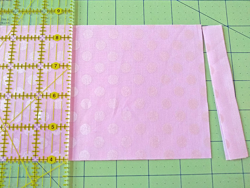 Slide the ruler 4½” from the trimmed end of the fabric, again using the gridlines of the cutting mat as your guide. Again align the ½” mark of the ruler to the gridline of the mat between the 4” and 5” measurement. If you need more than one square, you can continue along the strip in 4½” increments, aligning and slicing in the same manner.