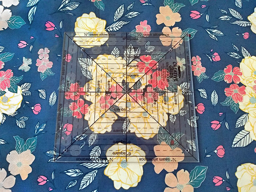 Perhaps you want to fussy cut a square, centering a motif within a 6½” square. One type of square-up ruler that makes this a frustration-free task is a 6½” square marked with concentric squares and diagonal lines. The concentric squares help center the motif so it is evenly placed within the square; the diagonal lines aide in positioning the ruler. You simply center your motif, then cut around the square with a rotary cutter.