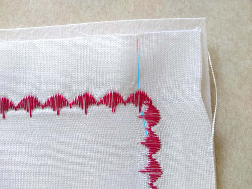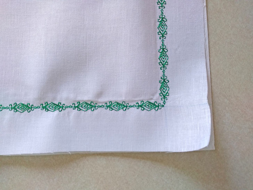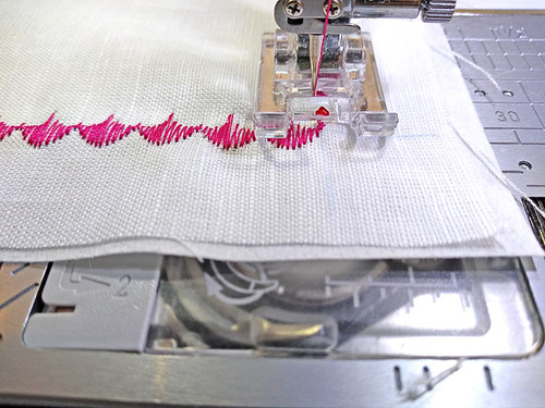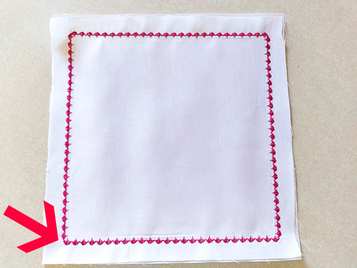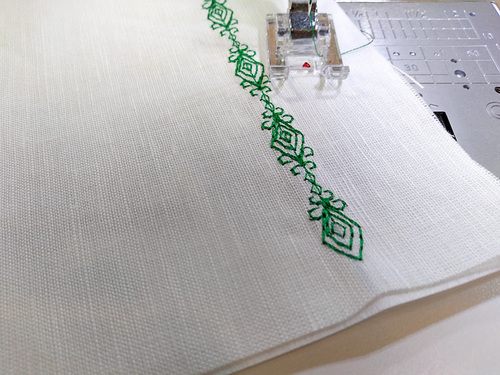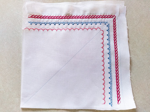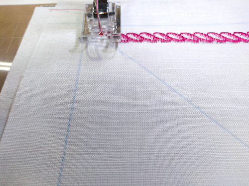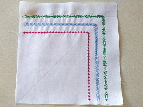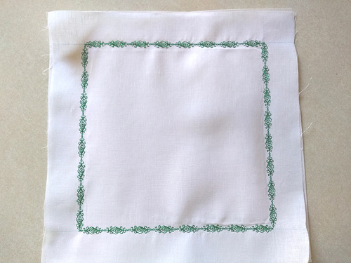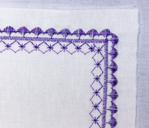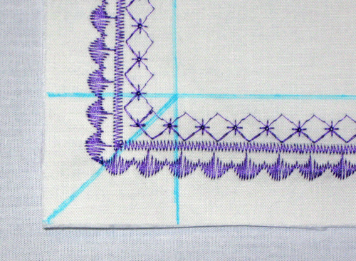 Again, our sample is sewn on handkerchief linen backed with tear away stabilizer. Start the stitching at a corner, lowering the foot where the lines intersect.