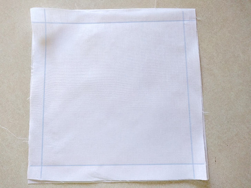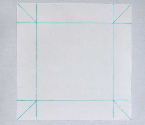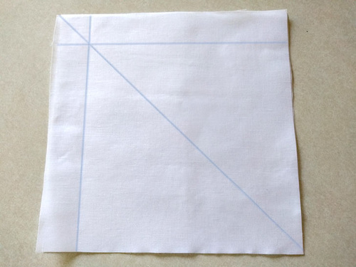 Stitch from the diagonal line toward the outer edge of the fabric, keeping the line of stitching parallel to the edges of the fabric.