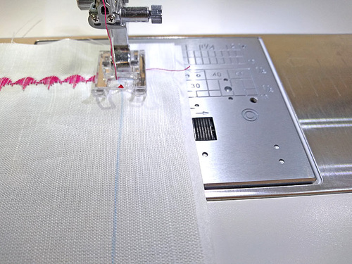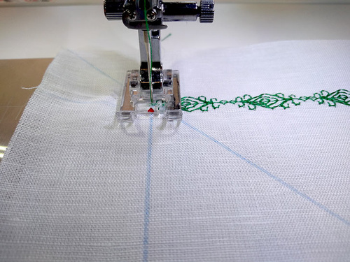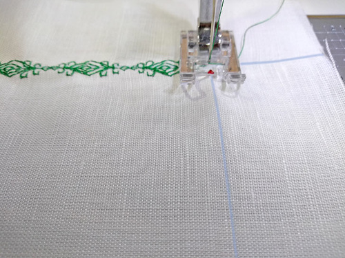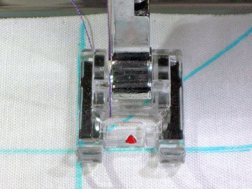 No problem! We simply lined up the beginning of the next row by placing the starting point even with the horizontal drawn line but just a smidgen outside the drawn vertical line to compensate. As you stitch the next row of decorative stitching, gradually return the drawn vertical line to the center mark of the foot.
