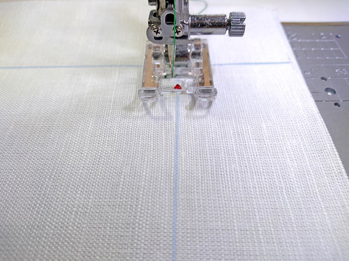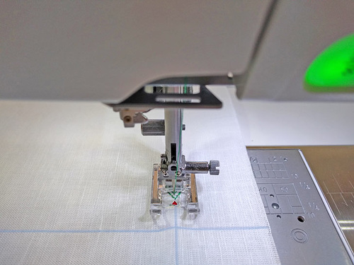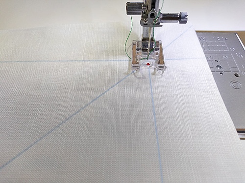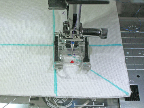 To start, center the presser foot over your drawn line and drop your needle directly into a corner intersection point. Start stitching along the guide line towards the first corner.