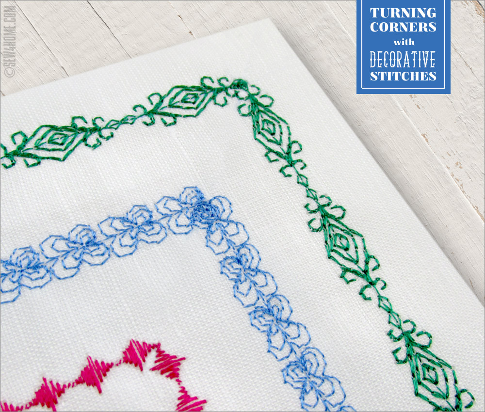 The keys to a good corner for any of the options outlined below are 1) start with a drawn guideline to follow, 2) stitch at a slow and steady pace, and 3) practice your stitch on scraps to memorize how the pattern forms and repeats.