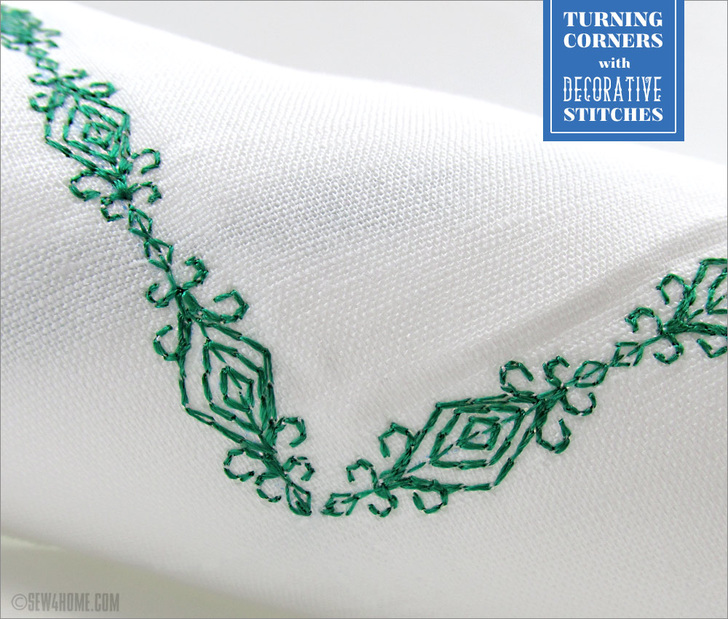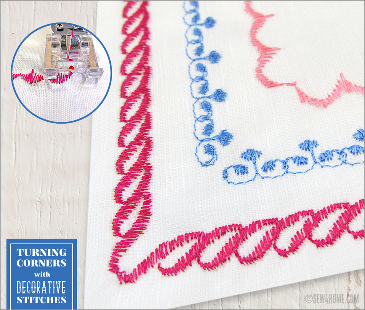 Did you ever have one of those cute little wind-up toys? It’s so fun to watch as it tick-tock walks across the floor. But what happens when it comes to a wall? Can it turn left or right or even stop? No! It just keeps going, ka-wonking its little toy head against the wall over and over and over. It’s a little like the decorative stitch. As long as you’re going straight, all is well. The pattern is pretty, the thread is colorful, it’s adding an amazing accent to your project. Then the corner approaches. If making a turn with a decorative stitch has you ka-wonking your own little head against the wall, we’re here to help with several ways to take a turn for the better.