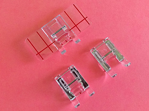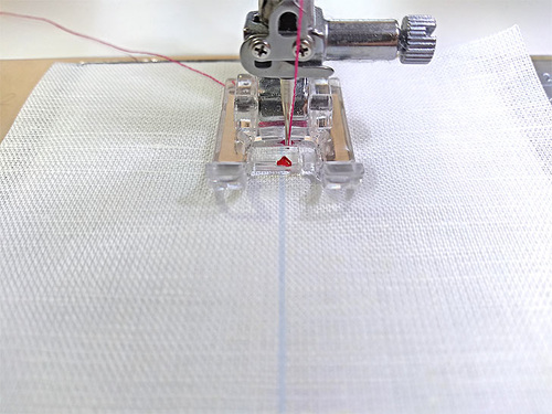 We are using the Janome Satin Stitch foot, which is standard on most Janome models. It’s transparent, so you can see the stitches forming beneath the foot, and it has a bright red arrow at the exact center needle drop. This arrow makes it very easy to follow your drawn guide lines. If you do not have this exact type of foot, another foot can be substituted, but do try to find and use a transparent presser foot for the best results.