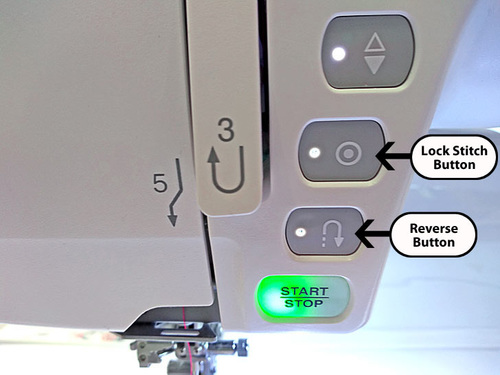 On most models of Janome electronic machines, you will find a Reverse button and also a Lock Stitch button.