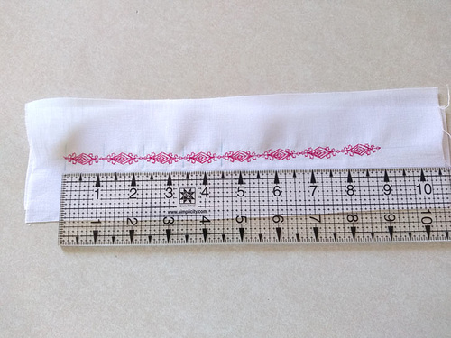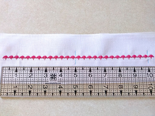 When the sample is complete, place a ruler alongside the stitching. Take note of the size of the pattern. Our sample pattern is small, only about ⅜“. It takes thirteen patterns to make a 5″ line of stitching. With this in mind, we decided to create a 10” square of decorative stitching.