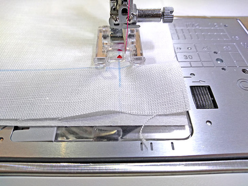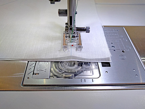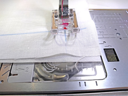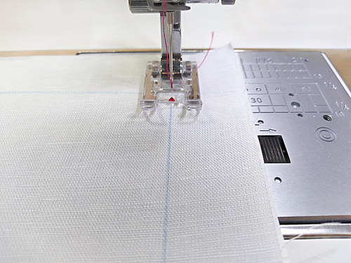 Start stitching, running the edge of the presser foot along the guide line towards the next corner.