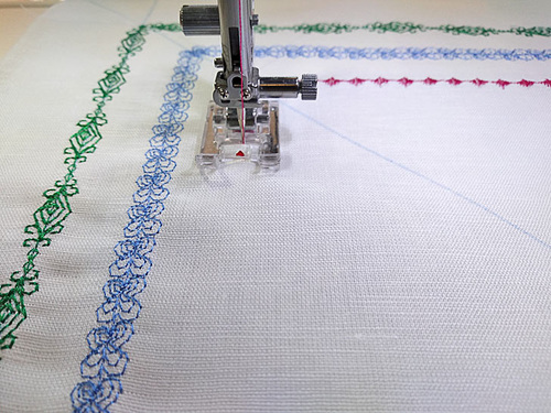 As mentioned above, always practice first. Draw several single corners onto a scrap of your project fabric. Test your chosen stitch to determine width and length, then watch how the pattern stitches out so you can recognize its true starting and stopping points.