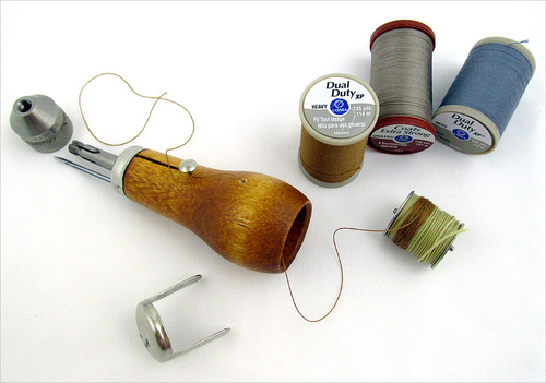 If you want to work with different colors of thread, other than the kind of twine color of the supplied waxed thread, you can use a heavyweight sewing thread. The good thing here is you don’t have to unwind the entire bobbin. Unwrap just a bit of the waxed thread to give yourself some room on the bobbin, then wind on the sewing thread. You only need to add enough of the new thread to finish your project.