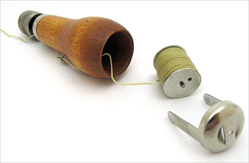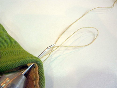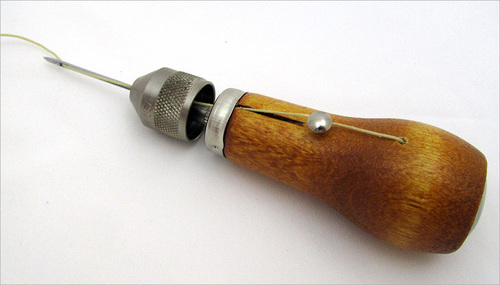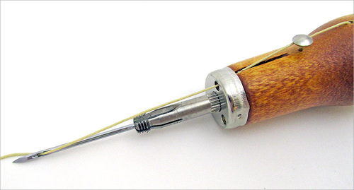 The hole in the side of the awl, through which the thread must be inserted, is at a bit of an odd angle – especially when working with thread softer than the waxed thread. We found it was easiest to first thread the new thread onto a regular hand sewing needle, then pass the needle through the hole, pulling the thread through with it.