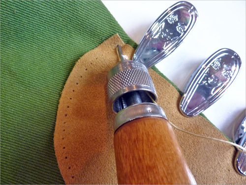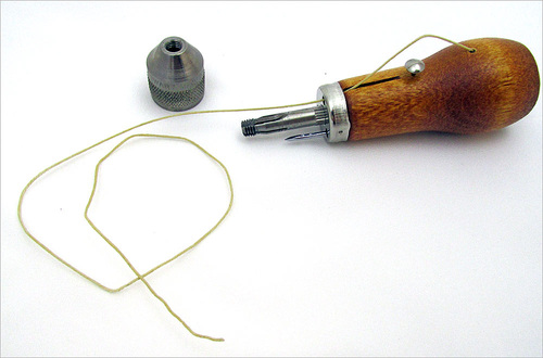 As you can see in the photo above, the awl comes pre-threaded. The bobbin in the base of the awl contains waxed polyester thread, and you also get an additional 30 yard skien of the same thread in the main package. This provided thread is a great standard weight, but you can also purchase heavier and/or finer options separately.