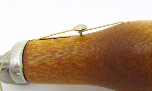 - Gently pull to unwind enough thread to complete your project plus about 3″ extra. You are pulling the end of the thread, which should be already inserted through the slot at the top of the handle and through the hole in the top of the ferrule.