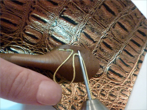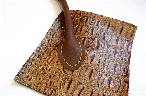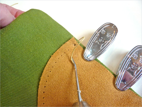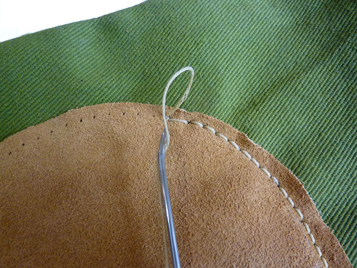 - We’re starting with an example of stitching through pre-drilled holes, using a leather patch we cut into a semi circle. We chose large clips to hold the patch against the fabric. Clips are better than pins when working with faux and real leather.