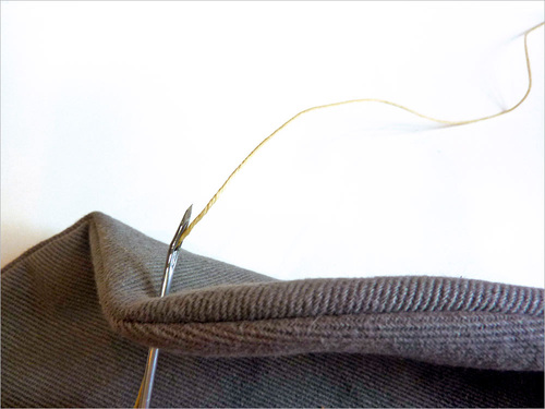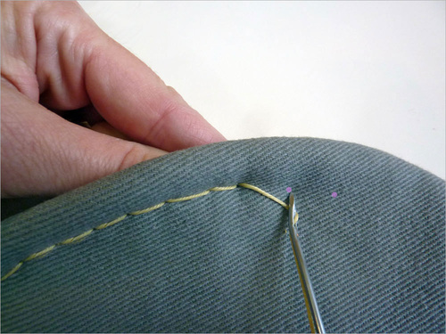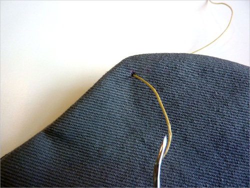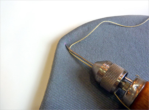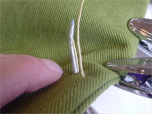 - At your starting point or first pre-drilled hole, push the needle into the fabric from front to back.