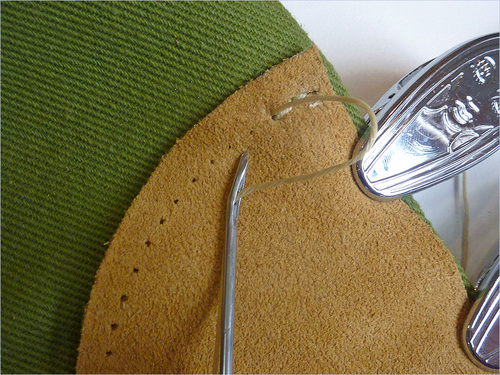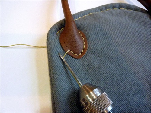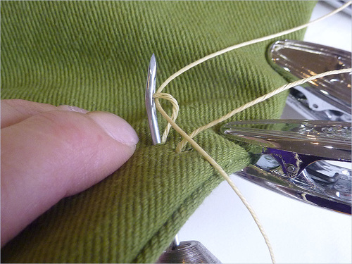 - Wrap the thread around the tack on the handle one time. This will create tension while sewing.