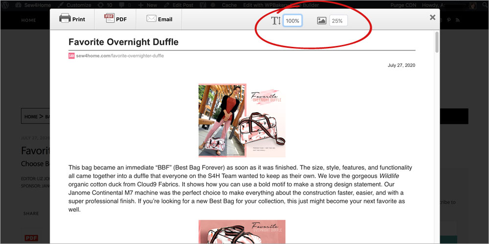 The overlay screen will display the article/project with the DEFAULT IMAGE size of 25% and the DEFAULT FONT size of 100%.