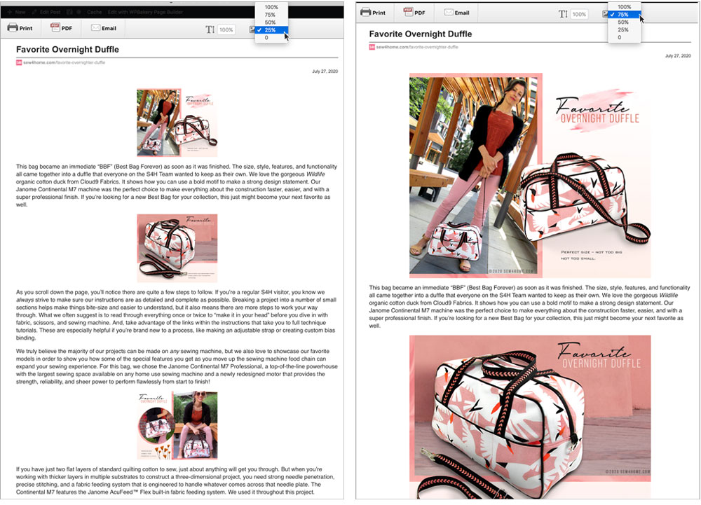 Click the size you wish to use. The images will instantly change to the new size so it’s easy to see if this is the look you want. Below you see the image size difference between 25% (left) and 75% (right).