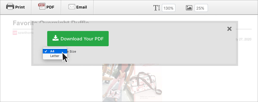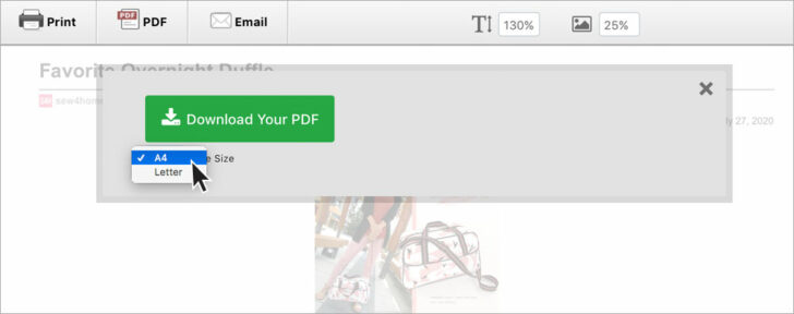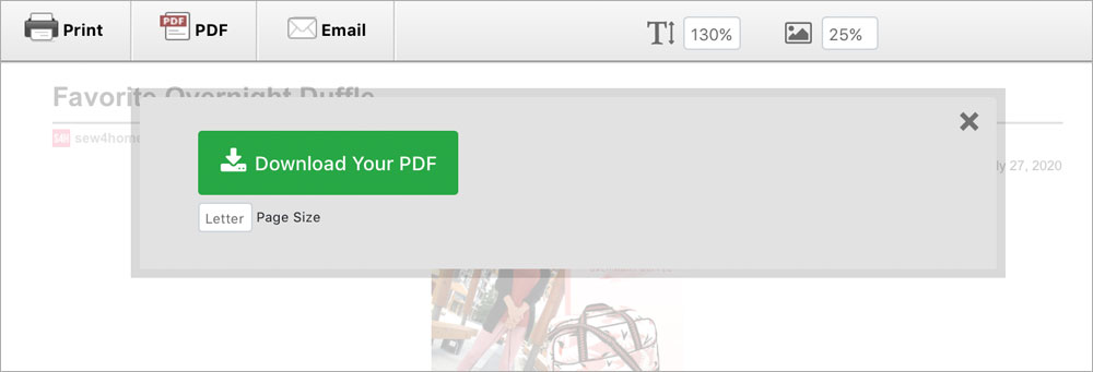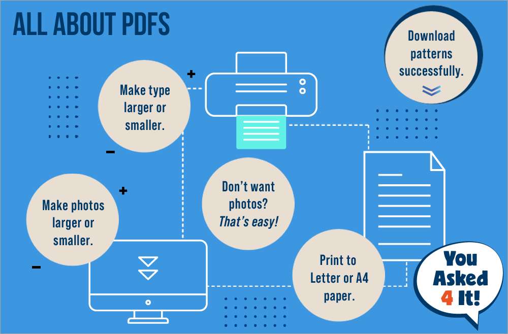 One important thing to remember: the PDF pattern(s) is a separate file from the PDF you generate of the entire article. This means if you save and/or print a PDF of the step-by-step instructions, you still need to click the link to download any PDF pattern(s) within those instructions. It is a two-step process because the files are generated separately by two entirely different pieces of software. This ensures the accuracy of the pattern while allowing for user flexibility in the PDF download font and image sizing described above.