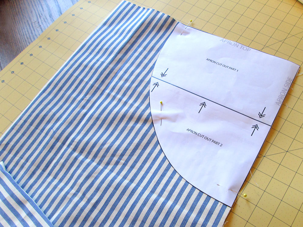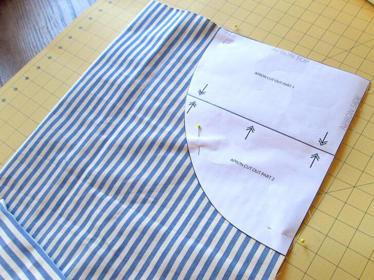 Sew4Home works very hard to create the fewest pages possible for each of our patterns in order to conserve your printing paper and ink. One of the ways we do this on some larger projects is to design the pattern pieces for the “negative spaces.” For example, on a traditional chef’s style apron, rather than creating many, many pages to assemble the entire body of the apron (what you’d likely find with a commercial pattern), instead we create just a one or two-piece pattern for the area the will be cut-away from the main rectangle of fabric. We call it our custom S4H Paper Saver Pattern™. In the photo below, you see an assembled “arm hole cut out” pattern in position on the main folded rectangle of fabric. Once cut away through both layers and opened up flat, you have your full apron shape. Clever!