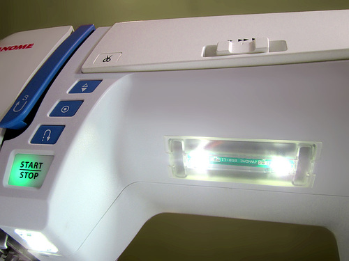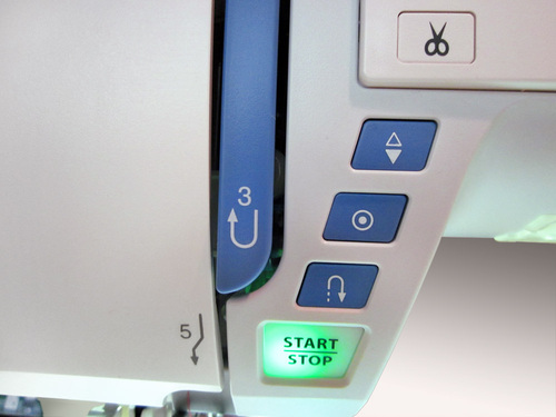 Heading down toward the needle, you see the blue operating buttons we mentioned above, the lower automatic thread cutter button (we love, love, love this), and the start/stop button. Once you’ve had a machine with a lower thread cutter, you will never want to be without one again. The start/stop button enables you to use the machine without the foot control. Using a machine in this manner is something that takes a little getting used to; but it can be very helpful for certain techniques and is considered a “universal” feature for anyone with certain physical restrictions.