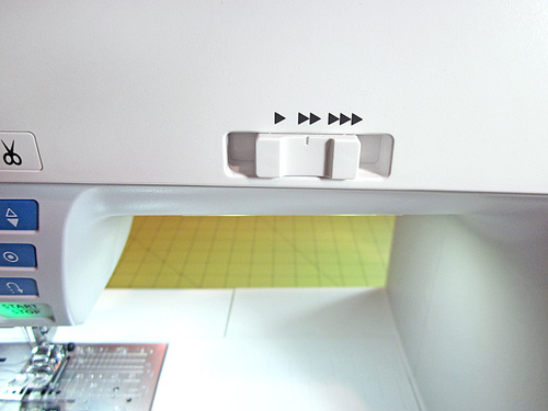 In the center of the machine is the speed control slider. This is a great feature for new and advanced sewers alike. Depending on the speed at which the slider is set, it doesn’t matter how hard you press on the foot control, the machine will only go as fast as it is set. It also controls the speed of the bobbin winder. Why is this so cool? Because sometimes when using specialty threads, you have to wind them more slowly than at full speed.
