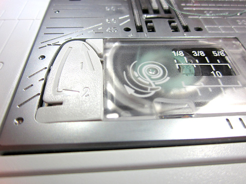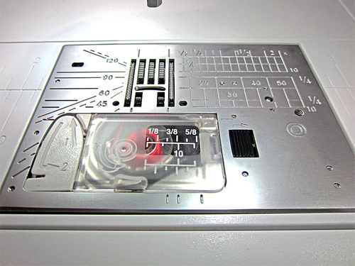 Below the needle is the needle plate and bobbin holder. If you don’t pay close attention to this area, you could miss some exciting features. The needle plate has seam allowance markings that extend beyond the plate onto the bed of the machine (to both the left and right of the needle). Plus, there are angle and pivoting markings – no more guessing seam allowances when turning a corner or patchwork piecing.